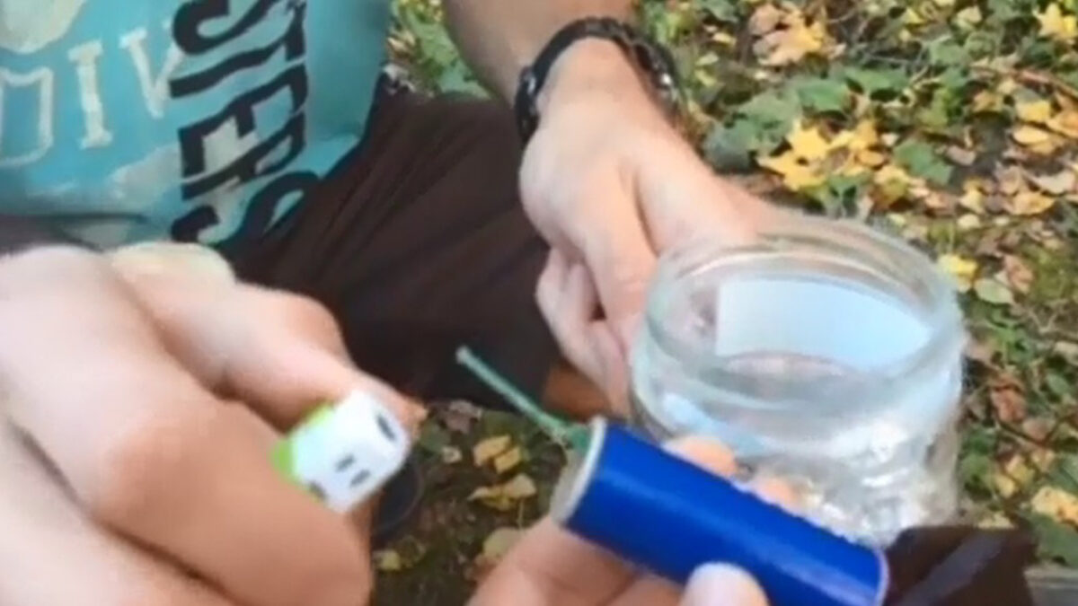Buurman en Buurman stoppen een vuurwerkje in een glazen pot