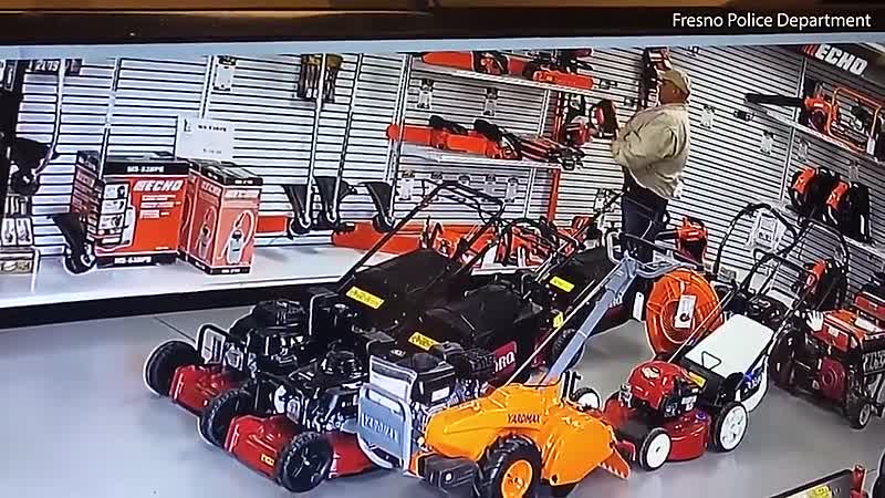 Opa met ballen van staal (en wijde broek) jat kettingzaag uit winkel