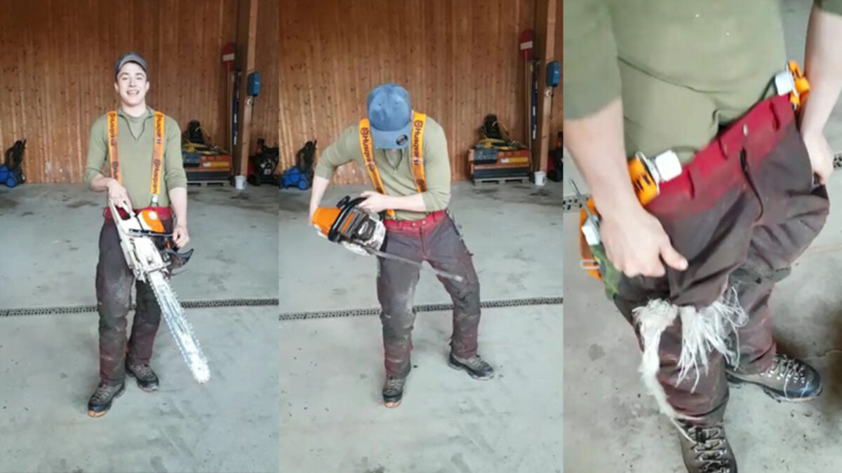 Deze Duitser laat zien hoe veilig een zaagbroek is. Zijn been ligt er niet af, dus een prima broekje. Toch?