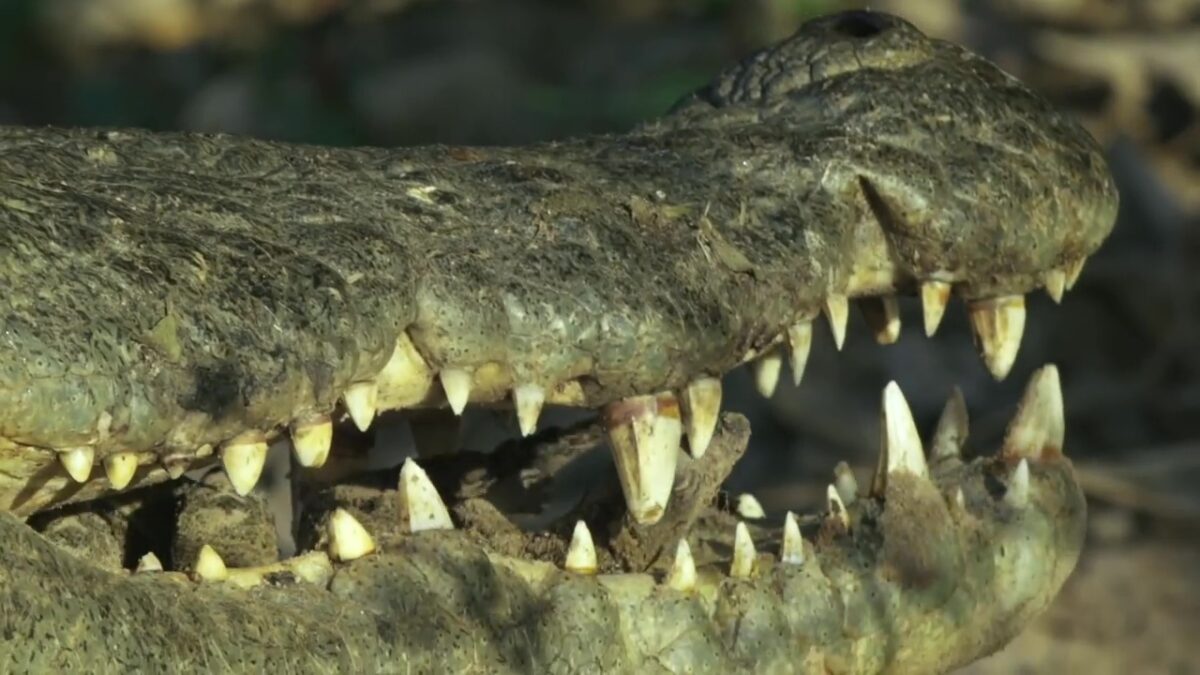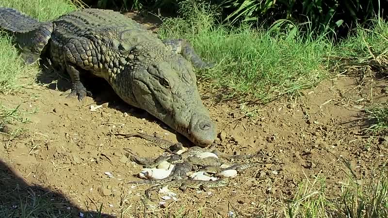 Krokodillenmoeder vervoert haar kroost in haar enorme bek