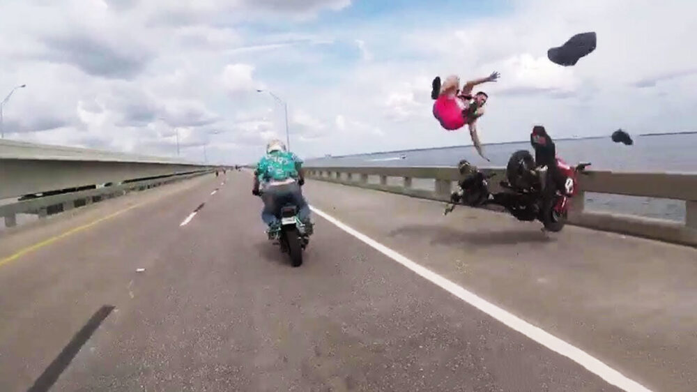 Gelukkig hebben ze een motorpak… ai, toch niet. Dat voelen ze nog wel even. Er raakten uiteindelijk drie motorfietsen gewond!