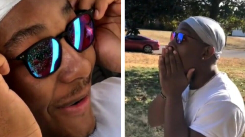 Kun je er nog zo stoer en 'gangsta' uitzien, maar als je voor het eerst in je leven dankzij een speciale #bril kleuren kunt zien ben je dolgelukkig. Deze man in elk geval wel!