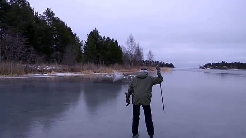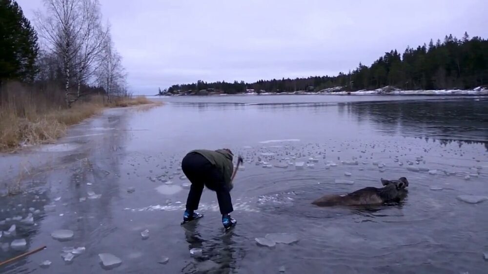 Ze zien een door het ijs gezakte eland verwoede pogingen wagen om aan land te komen en besluiten een handje te helpen. Na ongeveer 30 minuten ijs hakken weten ze hem veilig aan land te krijgen. Klåsse 💪