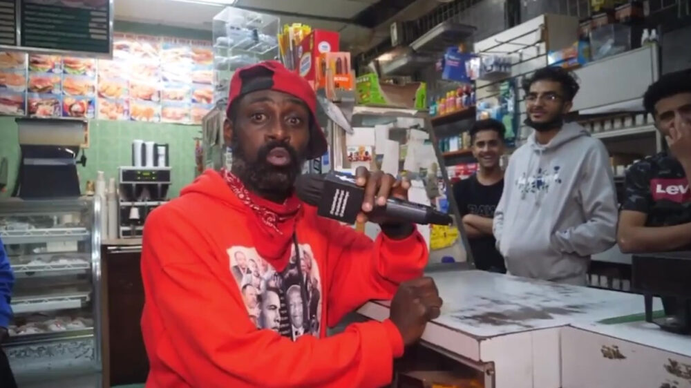 Als interviewer moet je natuurlijk wel een beetje weten wáár je met mensen gaat praten. Ga je in een normale winkelstraat staan dan zul je naar bijzondere quotes moeten zoeken, maar als je net als deze meneer bij een slijterij in een iets mindere buurt met je microfoon gaat lopen wapperen dan weet je zeker dat je een gekkie in beeld krijgt.