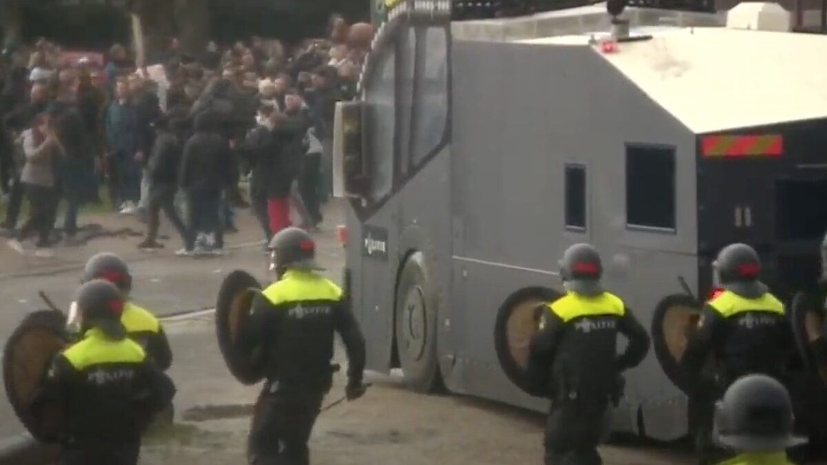 Omdat ze geen afstand hielden werden er waterkanonnen ingezet, maar dat leek niet het gewenste effect te hebben. De ME werd vervolgens bekogeld met vuurwerk en straatklinkers. Boeeeeeeeeehoeeeee.