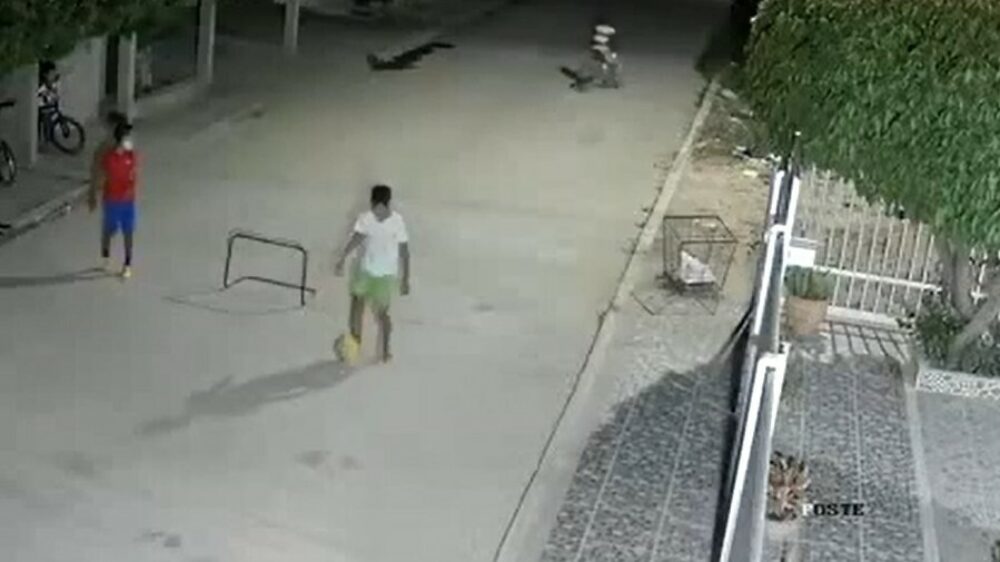 "Let op hoe ik die scooterrijder een dikke panna geef".