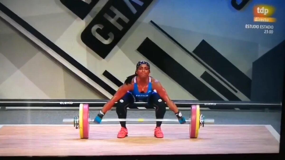 De Franse Gaelle Nayo Ketchanke doet tijdens het EK een poging om 107 kilo te heffen. Haar arm steekt er een stokje voor.