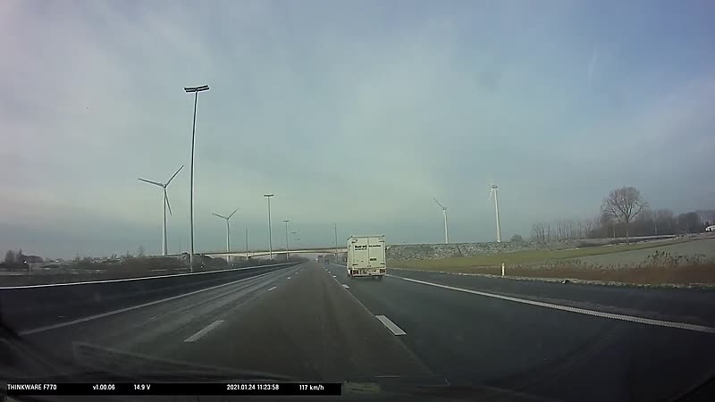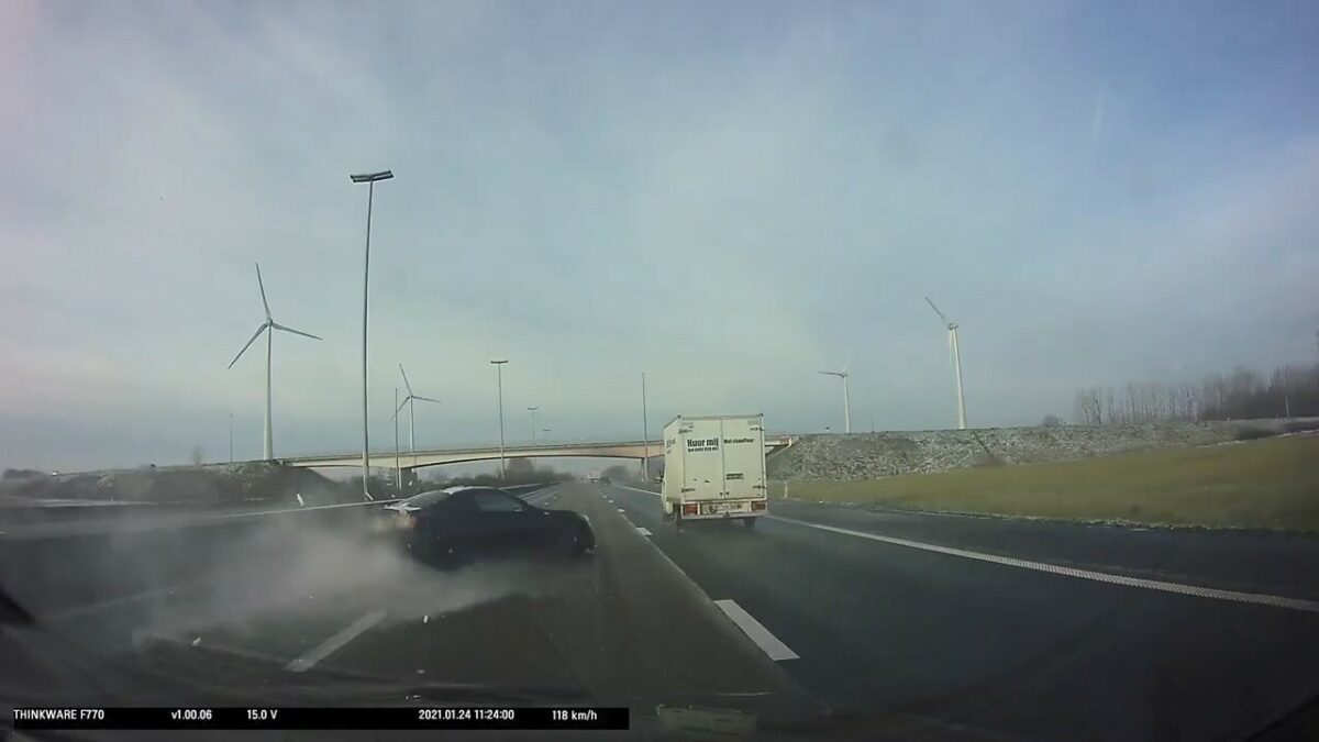 Stuntpiloot komt bij het Belgische plaatjes Kalken op de snelweg in de slip en neemt vervolgens een vrachtwagen mee de vangrails in. Deze dashcamfilmert heeft na dit voorval waarschijnlijk iets anders in z'n slip.