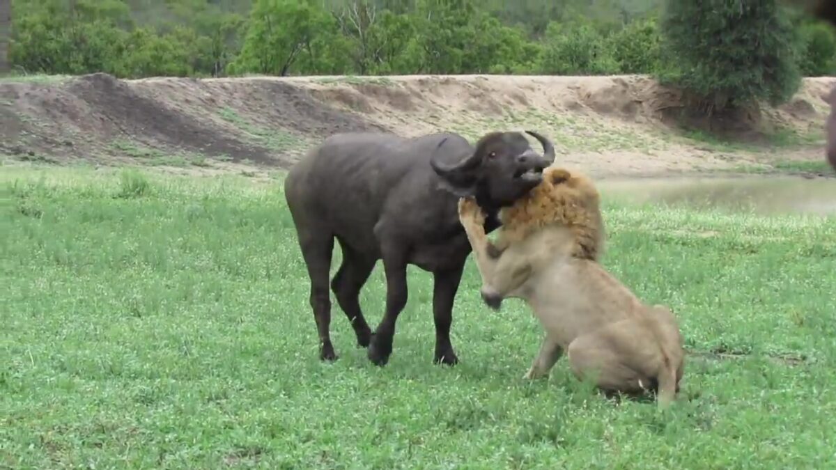 Het komt niet vaak voor dat een leeuw in zijn eentje een hele ploeg buffels aanvalt, maar in dit geval levert het hem een flinke avondmaaltijd op.