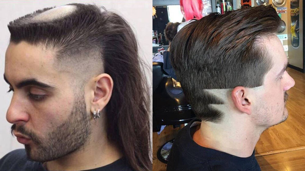 Vreemde figuren tonen vol trots hun belachelijke kapsels