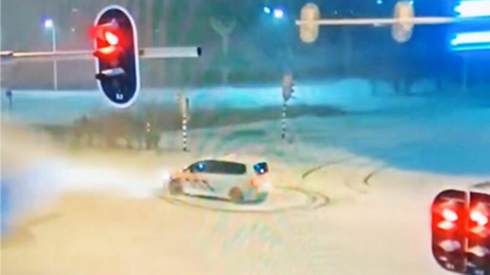 Agenten draaien lekkere donuts op een besneeuwd kruispunt in Zutphen