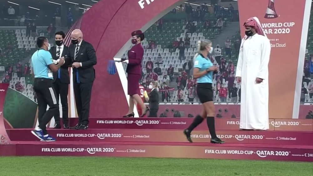 Blijkbaar was daar afgelopen donderdag ook de finale (Bayern München tegen Tigres, eindstand 1-0) en eindceremonie van het WK clubs. Feestje! Laat het rozenwater maar stromen. Alle voetballers kregen van sjeik Joaan bin Hamad Al Thani een boks (#coronavirus hè) en uiteraard was het daarna de beurt aan de officials. Zou je denken.