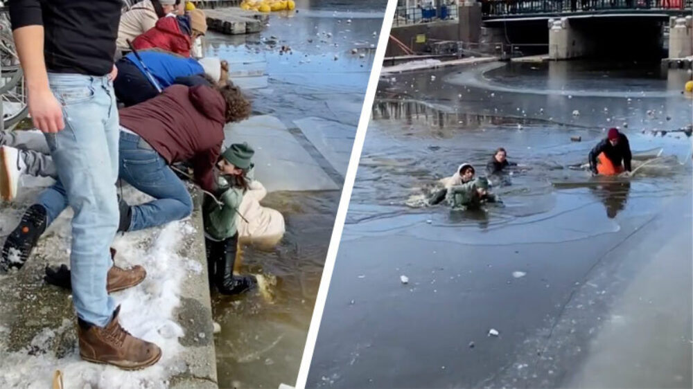 Schaatsers gefilmd die gisteren op de Prinsengracht massaal door het ijs zakten
