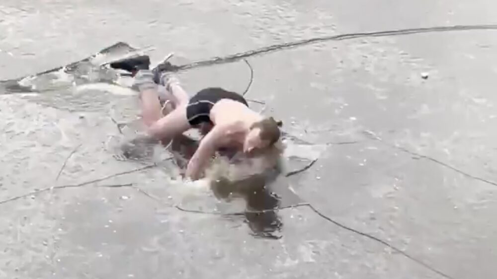 Het ziet er een beetje afgesproken uit, maar dat neemt niet weg dat deze fanatieke schaatser op de Keizersgracht vandaag behoorlijk viraal gaat op den interwebs. Meer dan 3.3 miljoen mensen zagen deze waaghals een stukje ijs pakken dat nèt niet dik genoeg was.