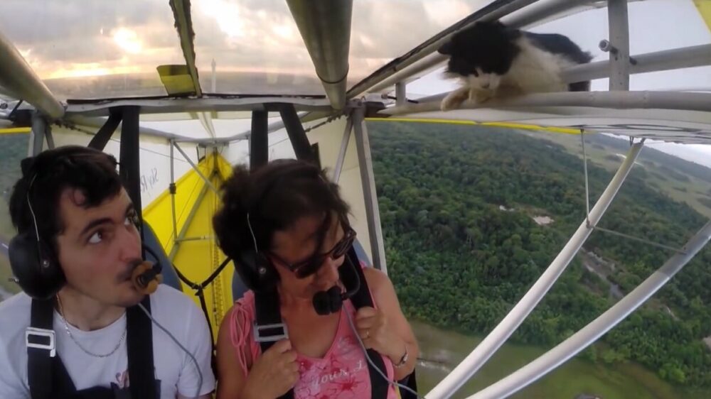 Je kijkt, net als deze piloot, wel even verbaasd als je erachter komt dat er een huisdier in de vleugel van het vliegtuig verstopt zit. Aan de glimlach op zijn gezicht is wel af te lezen dat hij er vertrouwen in heeft dat het allemaal goedkomt met de poes naast hem.
