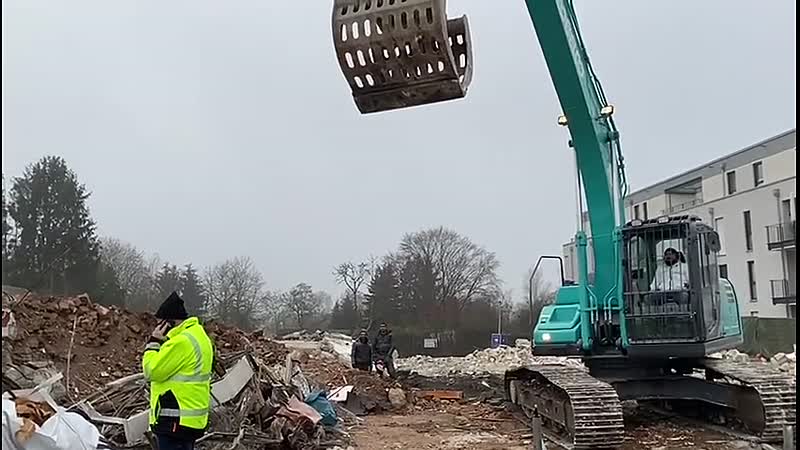 Lollige graafmachinist trekt muts van zijn collega's kopf af