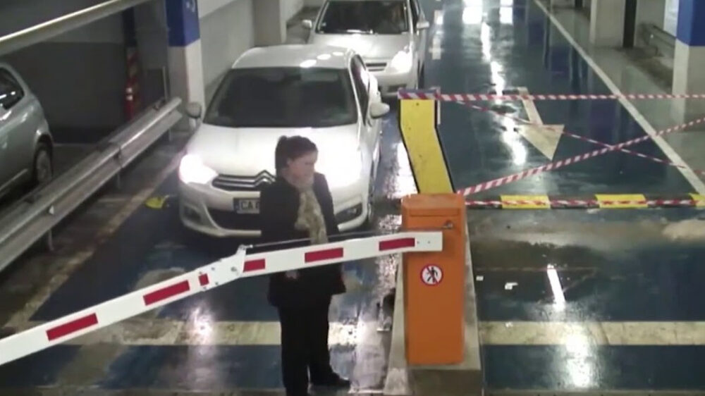 Vrouwelijke automobilist heeft ruzie met slagboom bij het verlaten van een parkeergarage