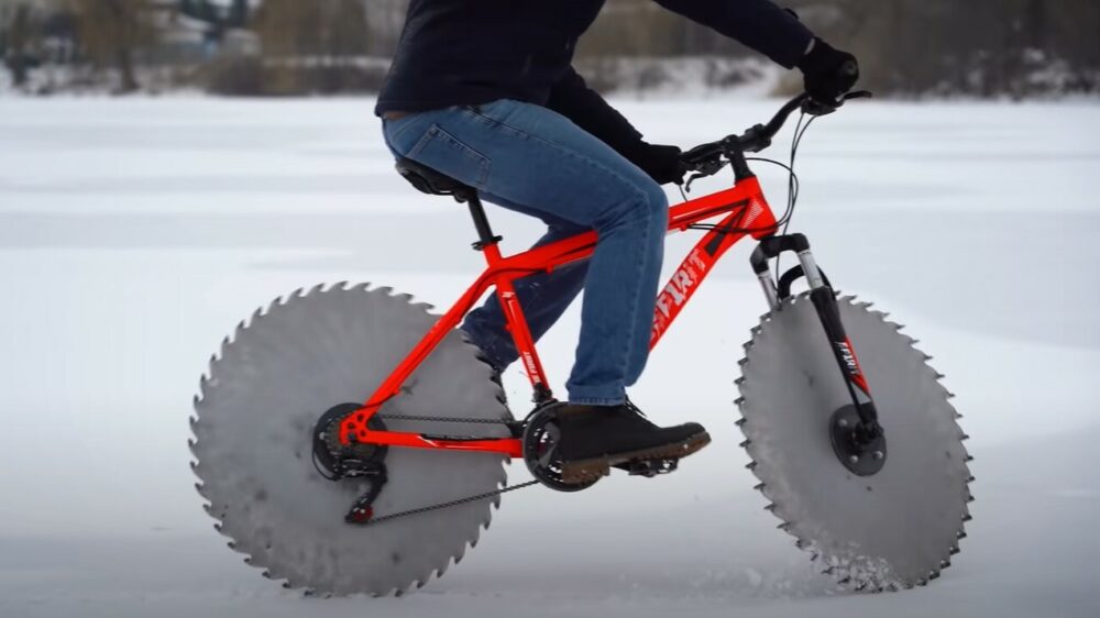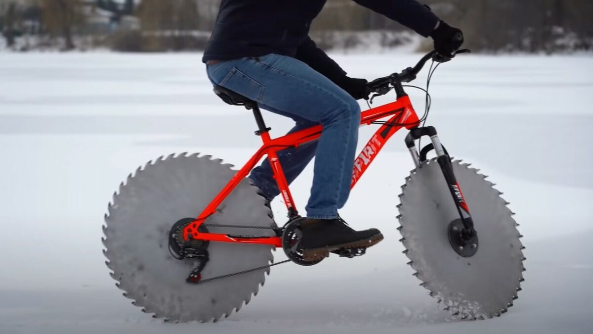 Een fiets met cirkelzagen om zo makkelijk over het ijs te rijden is misschien helemaal niet zo'n gek idee, toch? Nou watjes, wie durft?
