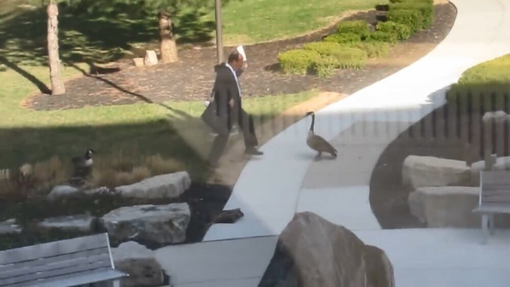 Oude doos: kantoorpik wordt aangevallen door lijpe gans