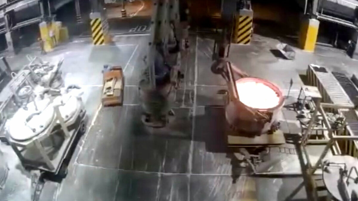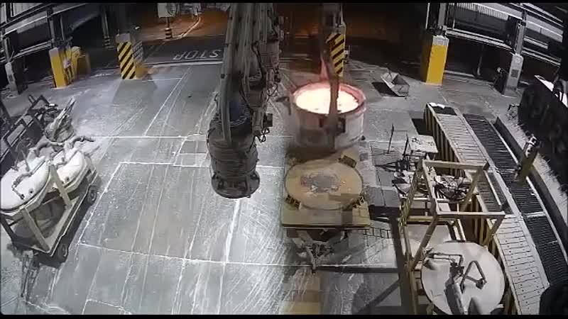 Met uiterste precisie wordt een enorme bak met gesmolten aluminium op z'n plek gezet. Als meneertje denkt alles fatsoenlijk te hebben losgekoppeld dan wordt het tempo iets opgevoerd; met alle gevolgen van dien 😱