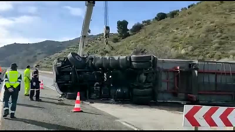 In het Spaanse Granada is een hijskraanchauffeur nog niet helemaal wakker als hij een gecrashte vrachtwagen in de berm probeert te zetten.
