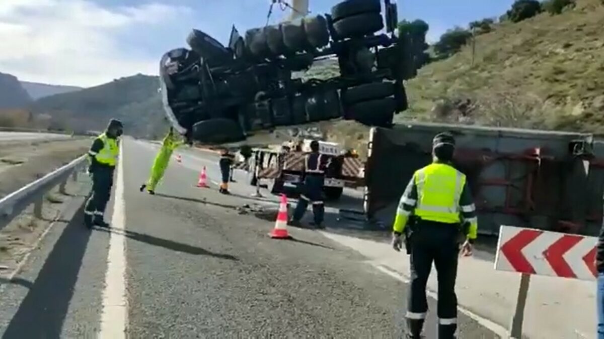 In het Spaanse Granada is een hijskraanchauffeur nog niet helemaal wakker als hij een gecrashte vrachtwagen in de berm probeert te zetten.