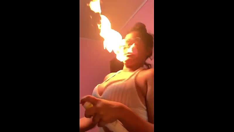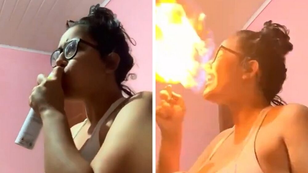 Ze doet een serieuze gooi naar een Darwin Award als ze het coronavirus uit d'r strot probeert te fikken. Ze rookt nog even lekker na.