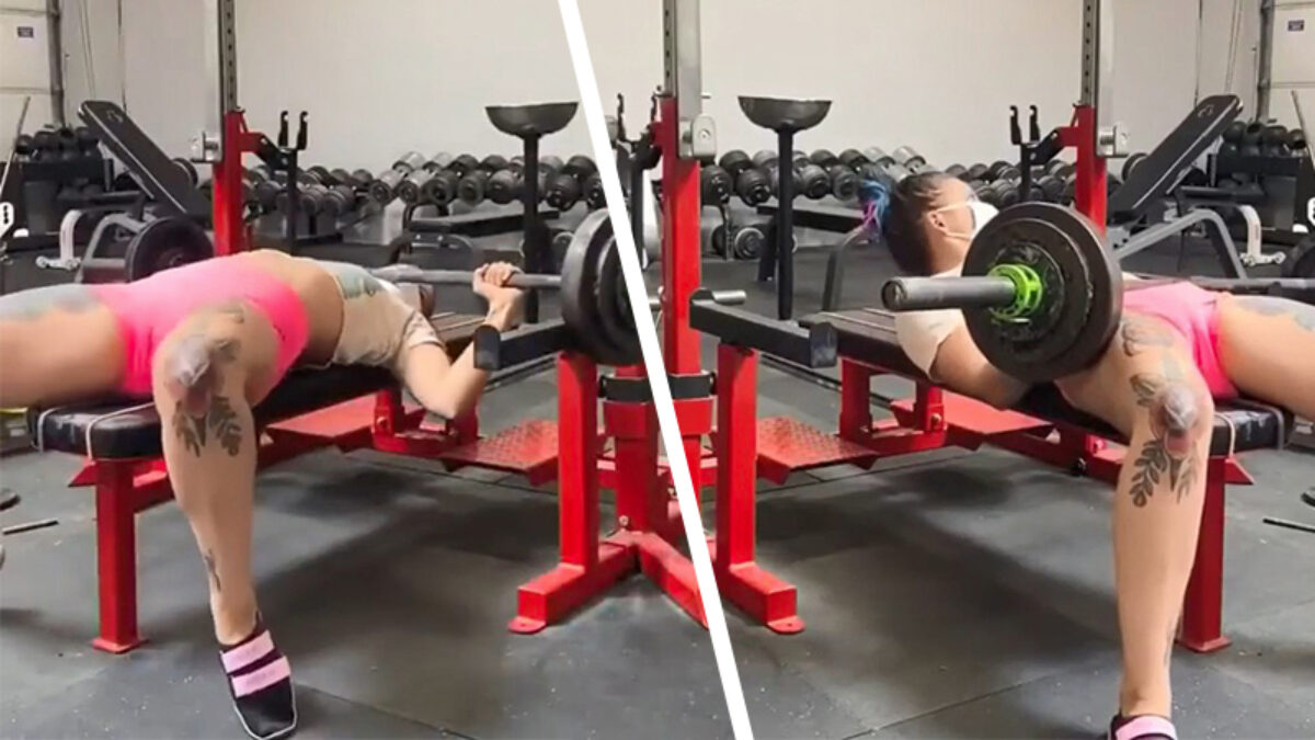 Sportschooltante neemt iets té veel hooi op d'r vork en wordt geplet tijdens het bankdrukken