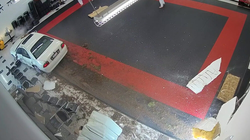 Tijdens je vechtsporttraining ben je natuurlijk enorm gefocused op je tegenstander, maar het gevaar kan soms uit onverwachte hoek komen. Dwars door de muur bijvoorbeeld, zoals deze bezopen bestuurder bij Leadership Martial Arts in Steele Creek, North Carolina even demonstreert.
