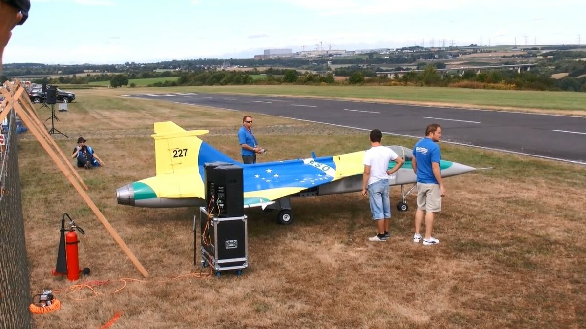 Je bent natuurlijk helemaal het mannetje met een 8 meter lange en 100 kilo wegende straalmotor aangedreven RC Saab Gripen gevechtsvliegtuig, maar wat zal hij balen als hij hem uit het niets in confetti ziet veranderen. Auw.