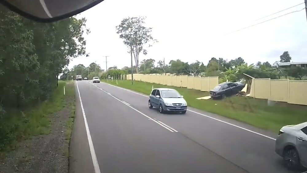 Een Aussie in een Nissan Pulsar trapt het gaspedaal nog even snel flink in om maar niet achter een vrachtwagen te belanden. Het lukt hem aardig, maar hij heeft net iets té veel vaart.