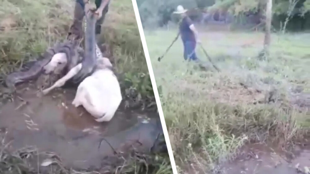 Helden redden kalfje uit de verstikkende houdgreep van een megaslang