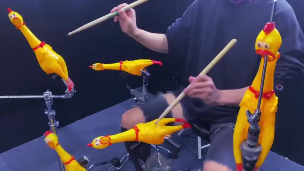 Met wat rubber kippen knutsel je een alleraardigst drumstel in elkaar