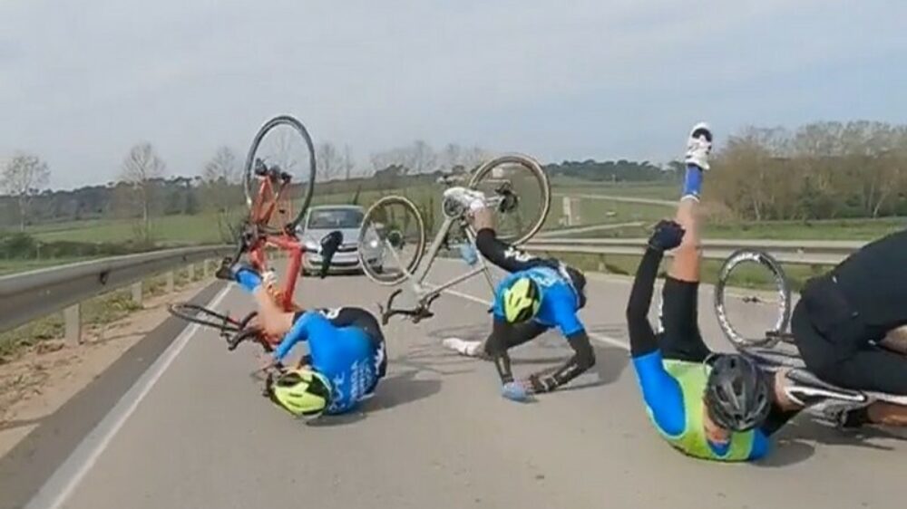 Mijn fout: dorstige wielrenner kegelt al zijn matties tegen de vlakte