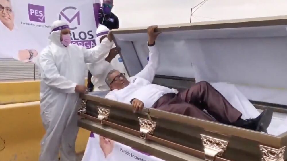 Aandacht vragen voor het enorme aantal doden door het #coronavirus en het geweld van drugskartels is altijd goed, maar om als politicus dan je campagne te lanceren door in een lijkwagen aan te komen rijden en uit een doodskist te stappen is op z'n minst een beetje gek.