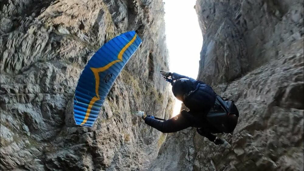 Niks te doen maar wel een stiekeme doodswens? Knoop dan gewoon eens een parachute-geval op je rug en vliegen maar! In dit geval speedflyen Alexandre Mulle en zijn homeboys door The Crack. Nee, viespeuk, niet dat!