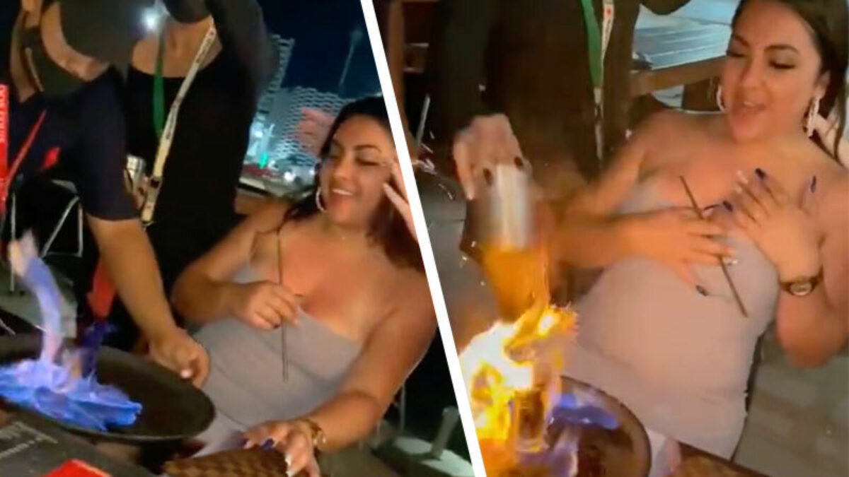 Geen wat er in het hoofd van ober precies misgaan, maar als je tafel in de fik staat kun je hem beter niet met een lading alcohol blussen. Wat een idioot!
