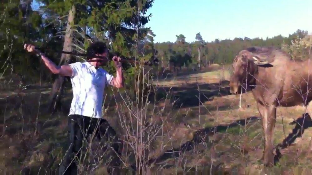 In Nederland blijft het vaak bij een kat, hond, eekhoorntje of konijn maar in Zweden kun je zomaar wat grotere dieren tegen het lijf lopen. Een eland bijvoorbeeld. Gelukkig zijn er ook Zweedse mannen met grote cojoñes die daar wel raad mee weten. Rrrrooooaaahhhh!!
