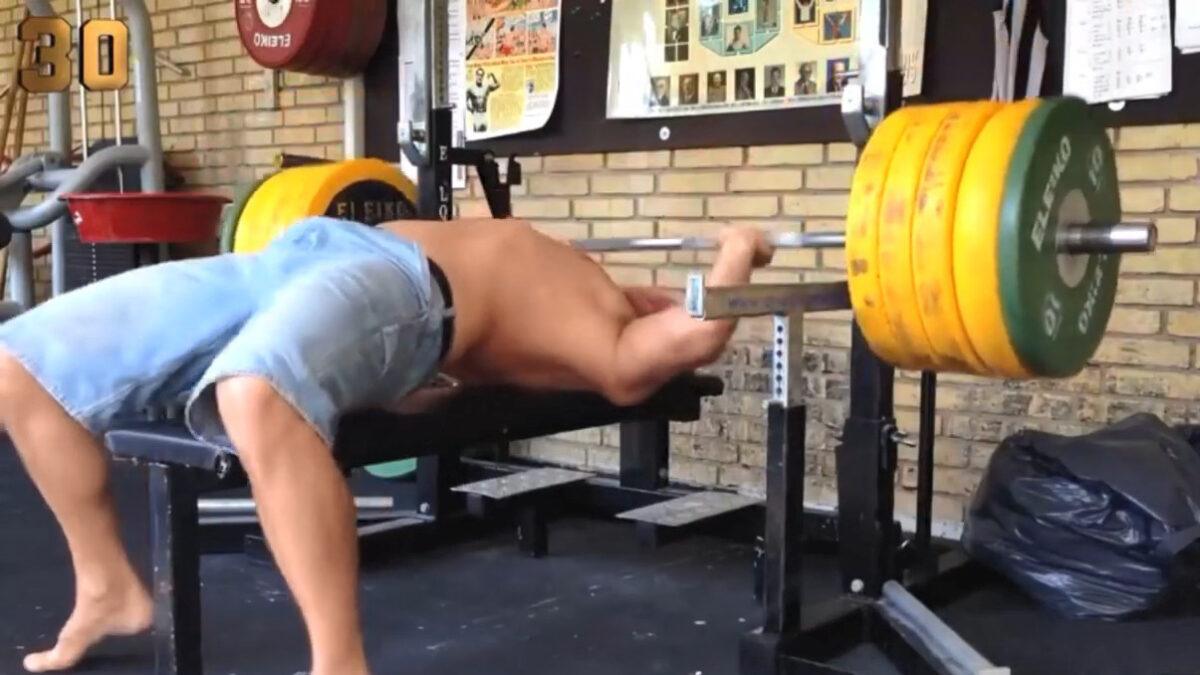 Zijn strottenhoofd is ook niet zo blij met zijn gewichthef-aspiraties. Het hoge gilletje (alsof zijn balletjes gekrompen zijn) op het einde maakt deze video helemaal af.