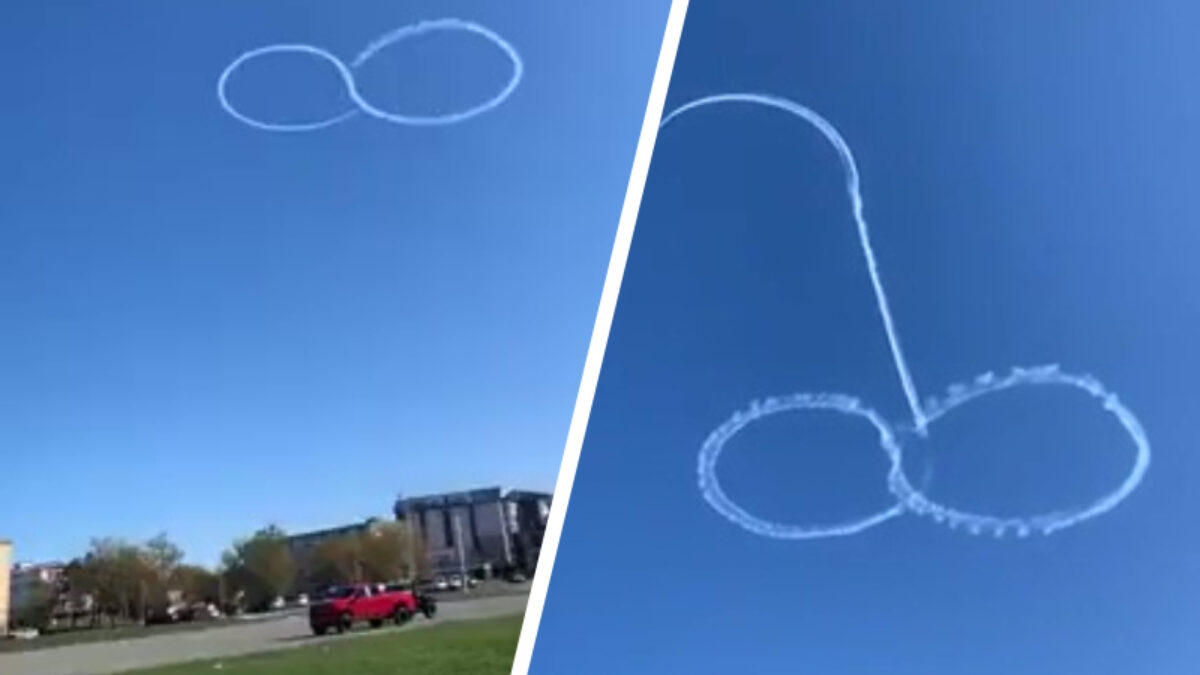 Natuurlijk is een piemel tekenen superkinderachtig, maar kom op, zo'n unit in de lucht tekenen met een fakking vliegtuig? Dan ben je gewoon een baas hoor!