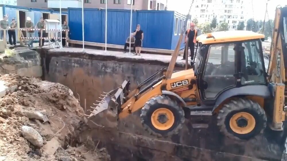 Russische kraanmachinist laat zijn graafmachine zeer zorgvuldig zakken