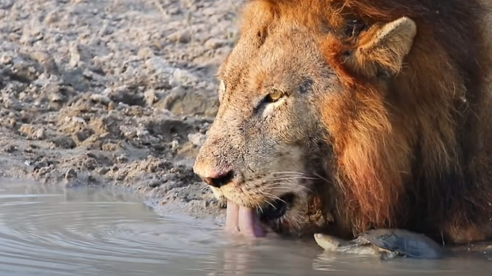 Als je naar het Kruger Park in Zuid-Afrika gaat dan hoop je natuurlijk epische gevechten tussen leeuwen, luipaarden en olifanten te zien. Lukt niet altijd, maar eerlijk is eerlijk: deze ruzie tussen een leeuw en een schildpad is er niet minder episch op. Ga weg joh, haarbal, ik zwem hier!