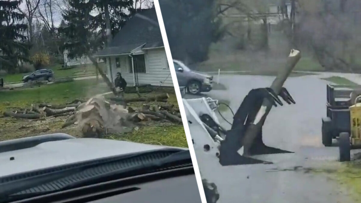 Zo'n plotseling wegschietende tak kan levensgevaarlijk zijn maar je kunt er ook verdomd mooie vangballen mee maken. Deze Bobcatbestuurder demonstreert even hoe, al was het waarschijnlijk meer geluk dan wijsheid.