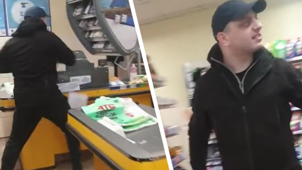 Altijd gezellig in Mariupol, Oekraïne. Enigszins agressief omdat zijn vriendin niet zonder #mondkapje mocht winkelen besloot deze engnek de supermarkt even op te zoeken en vakkundig met zijn bijl te slopen. Saillant detail: het geheel zou door zijn kind gefilmd zijn en de beelden zijn door hem zelf op social media gezet. Nou kerel, dan maken we je toch even beroemd?