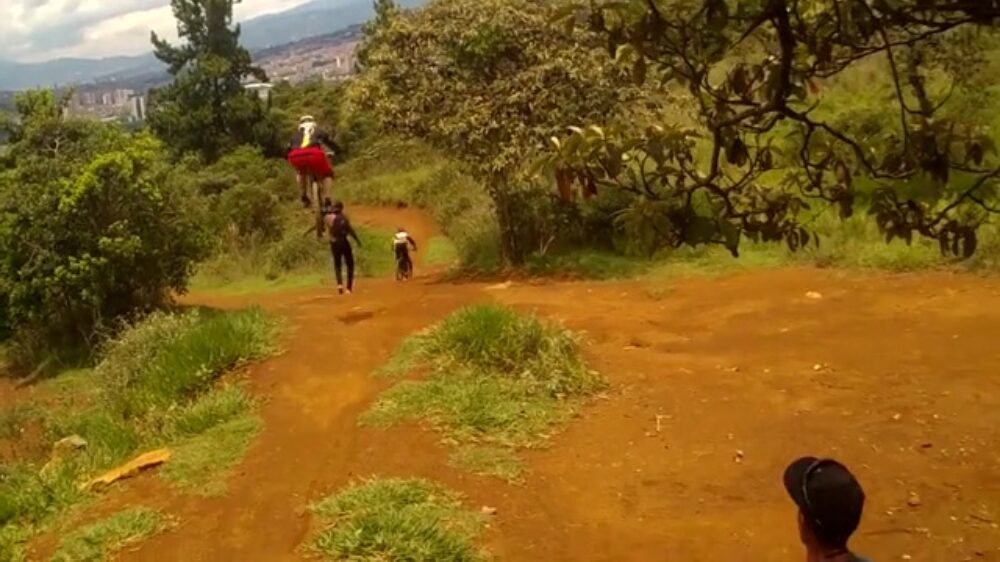 Argeloze toeschouwer krijgt tijdens wedstrijd ineens een MTB-er in zijn nek Fails