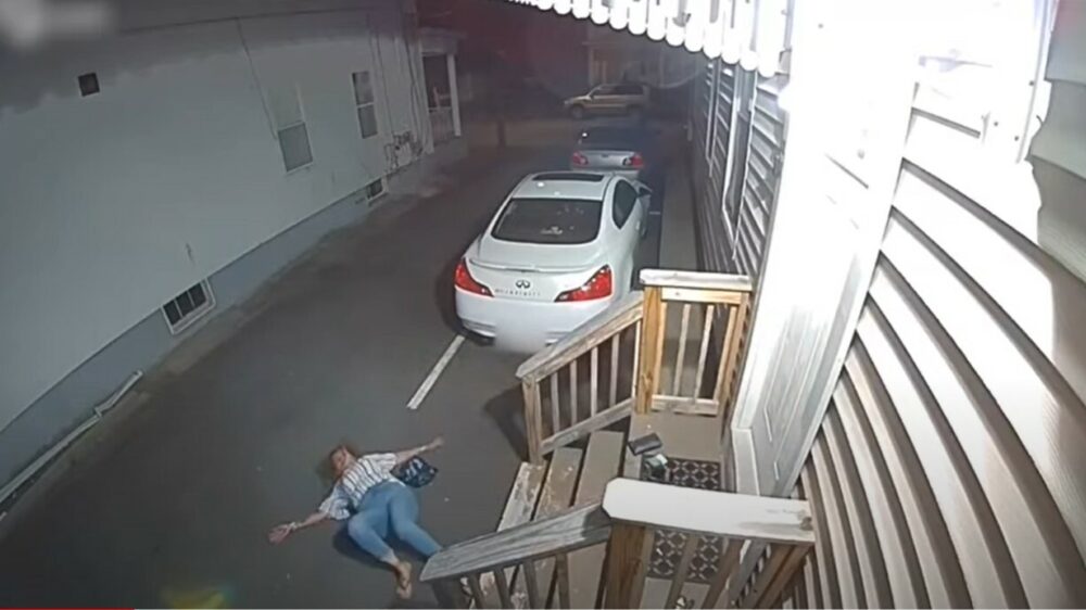 Beschonken Barbara struikelt en geeft d'r voordeur een kopstoot