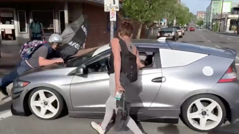 Kruispunt geblokkeerd door demonstranten, automobilist geeft gas