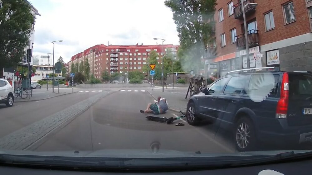 We zijn vandaag weer in Zweden, dus om het filmpje helemaal perfect te maken weten ze met hun elektrische step ook nog eens een geparkeerde Volvo uit te zoeken.