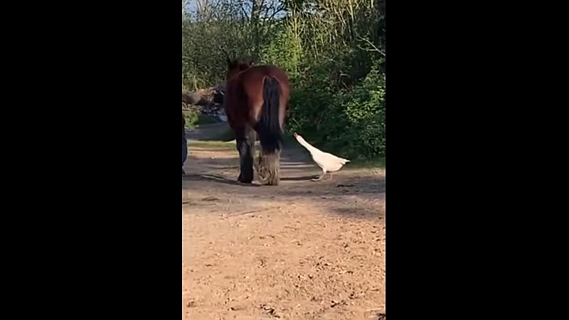 Paard laat met welgemikte trap weten wat 'ie van deze irritante gans vindt Dieren