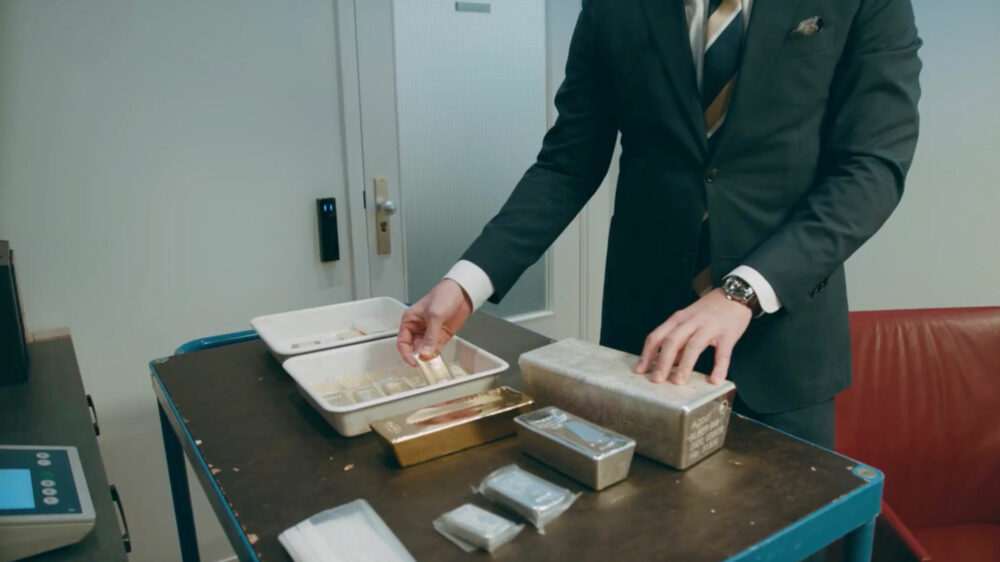 Dat we hier mogen filmen is eigenlijk heel bijzonder’’, stelt de medewerker van de Amsterdamse beleggingsfirma Gold Republic. Ook heeft hij het over ‘gigantische bedragen’ die het goud en zilver in het pand waard zijn.